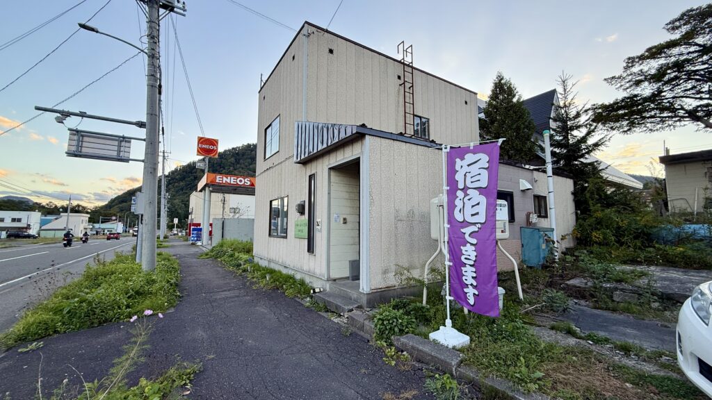 その名の通り JR新夕張駅から徒歩わずか2分、さらに ENEOS(ガソリンスタンド)横 という分かりやすい立地にあり、遠方から訪れる観光客やビジネス利用の方々に大変好評です。目印は紫色の 「宿泊できます」 のぼり旗で、初めて訪れる方でも迷わず安心してお越しいただけます。